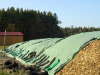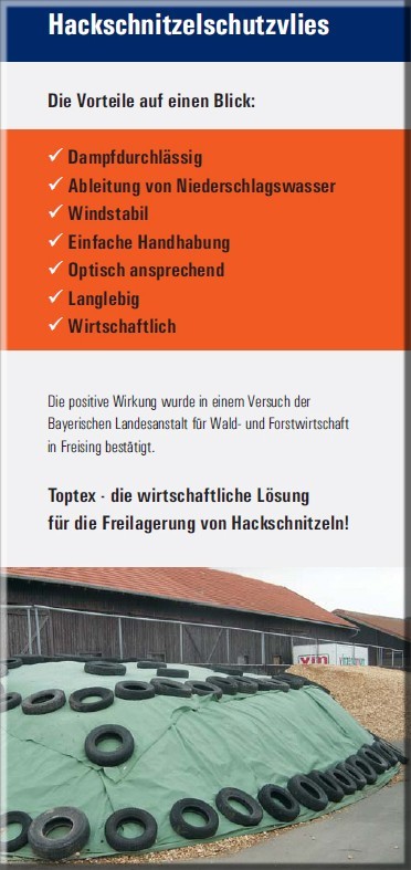 Das atmungsaktive TOPTEX läßt die Feuchtigkeit, die durch die Eigenerwärmung der Hackschnitzel entsteht, hindurchdiffundieren. TopTex ist atmungsaktiv, die Hackschnitzel trocknen ab.